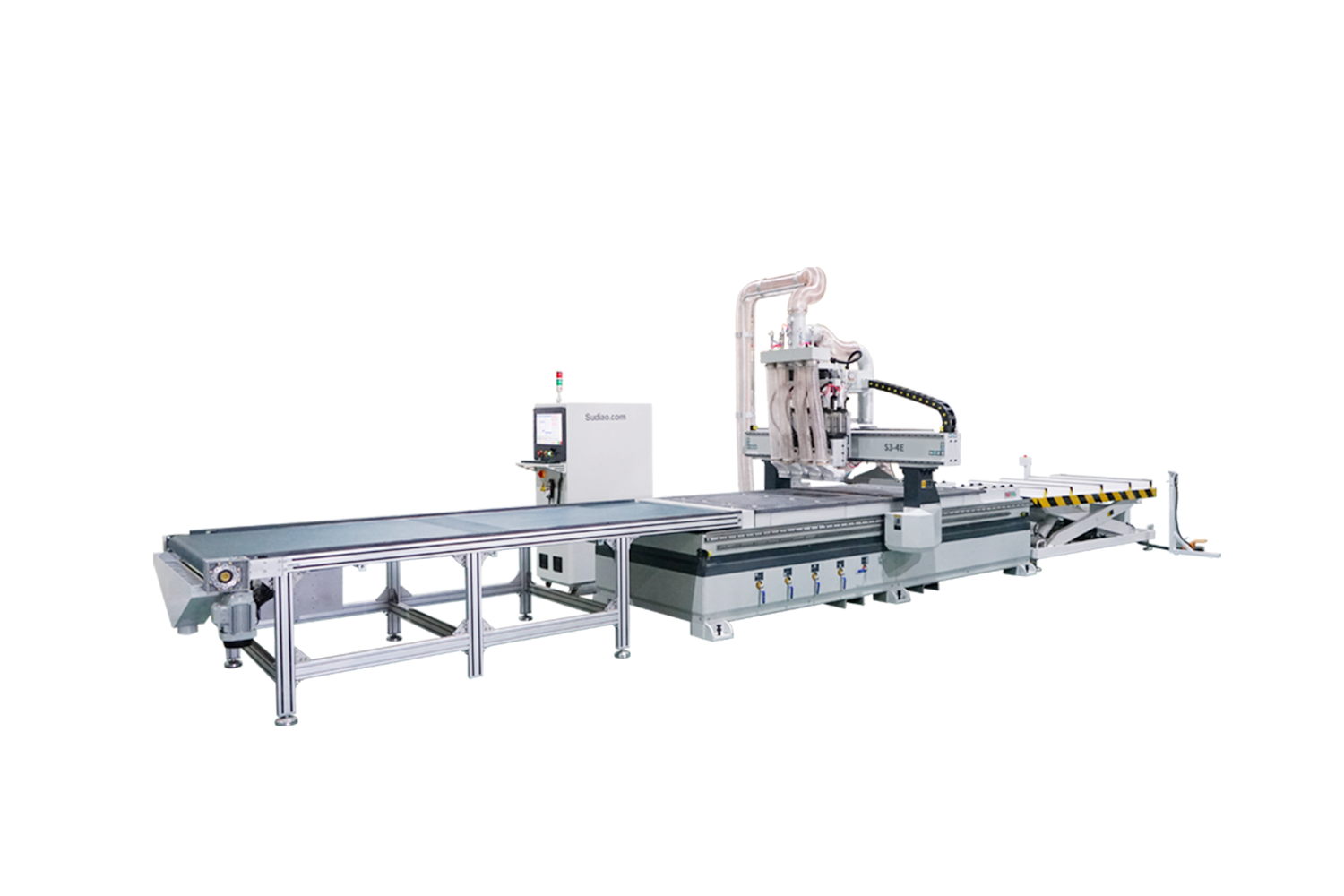 在雙面鉆單元與開料單元之間設(shè)有吸塵和吹灰裝置,保證整板無黏附顆粒送入開料單元,確保整板在開料單元吸附均勻平整。