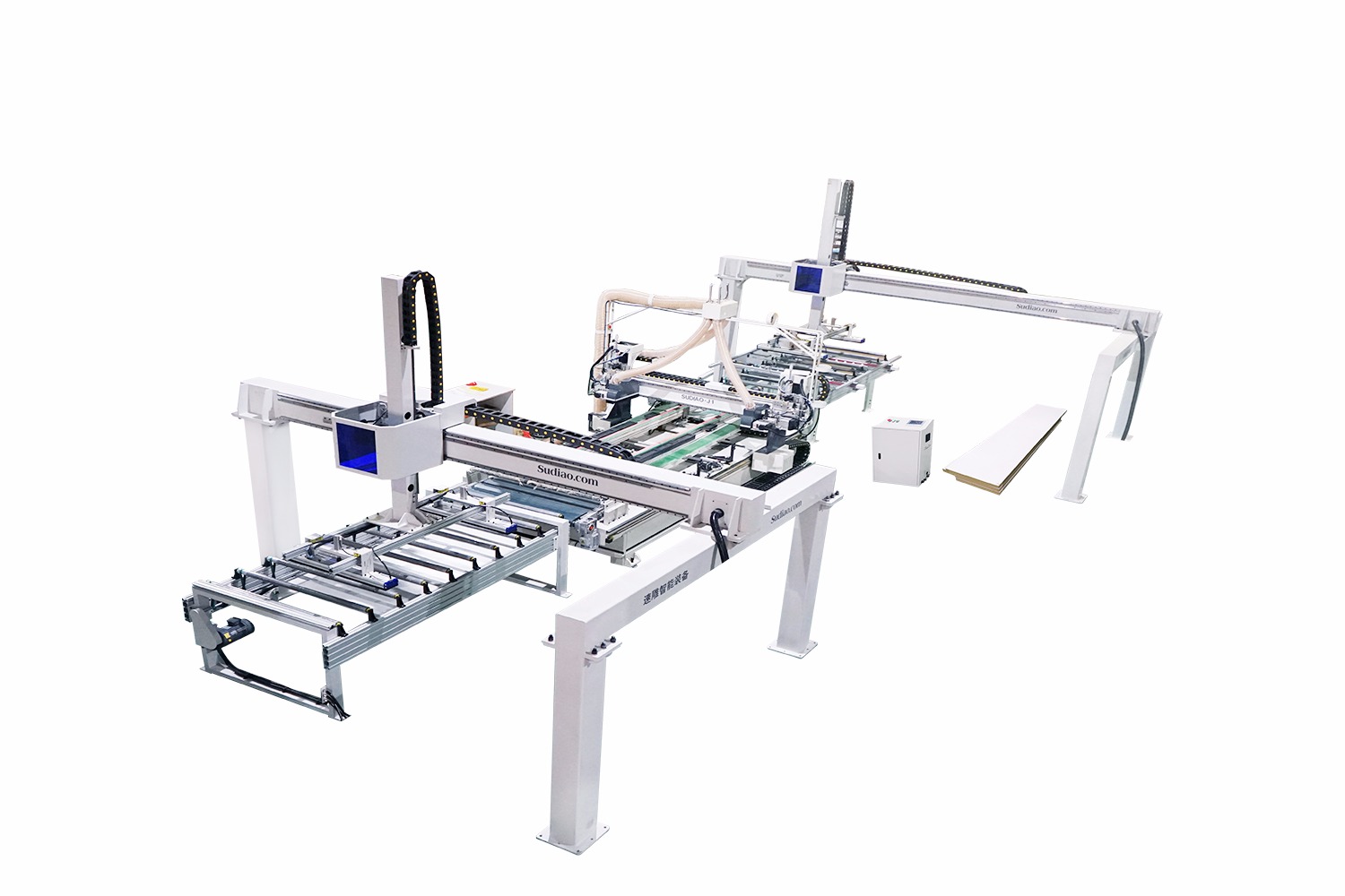 四邊鋸配合上下料龍門架、動(dòng)力對(duì)中輥筒、輥筒輸送機(jī)(帶廢料收集功能)組成木門規(guī)方生產(chǎn)連線。